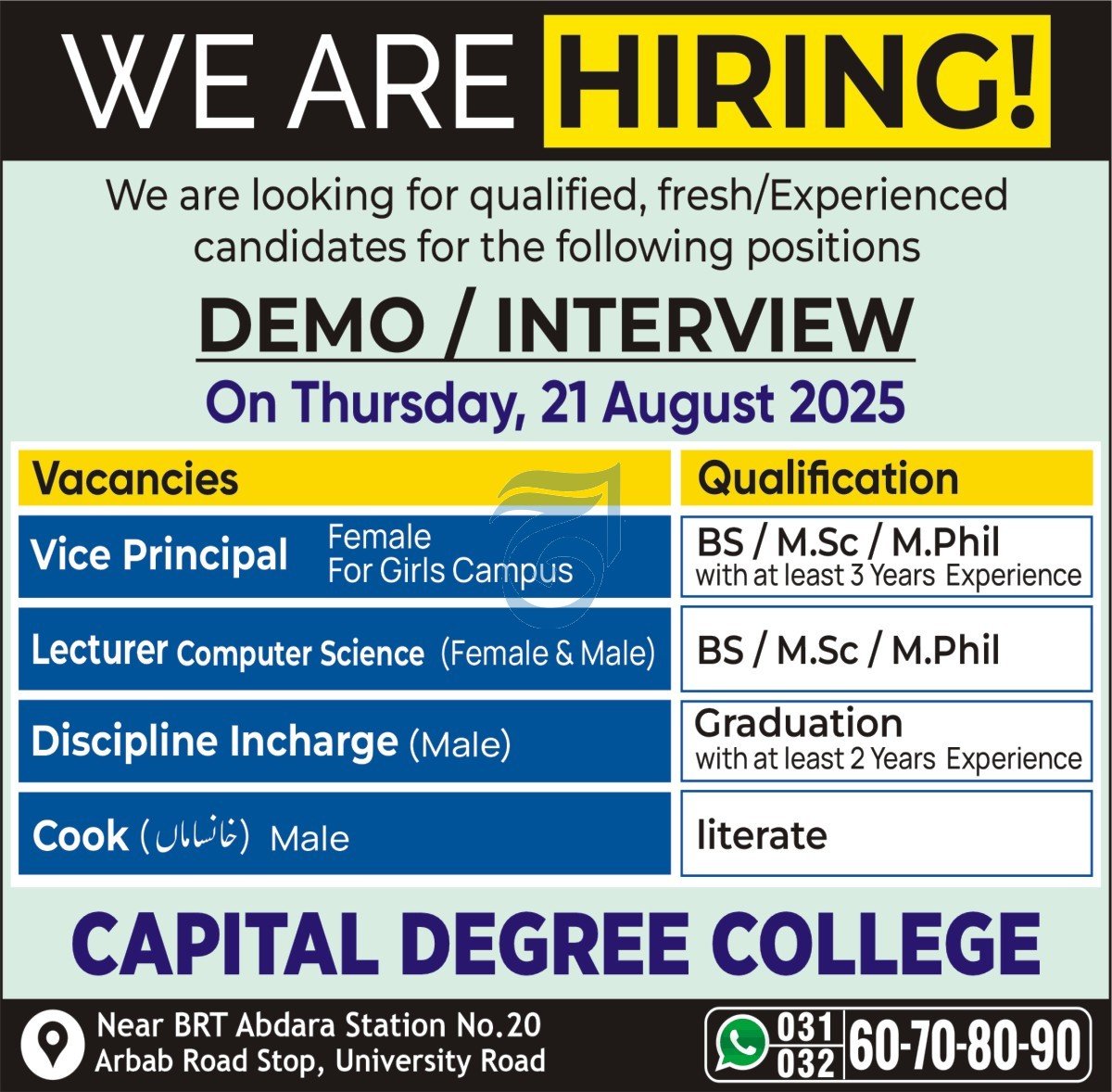Capital Degree College announced new jobs for the position of Vice Principal, Lecturer, Discipline Incharge, Cook. These jobs are related to Management category and Government jobs. The minimum qualification required for this job is Primary, Bachelor, Mphil, M.sc, BS.