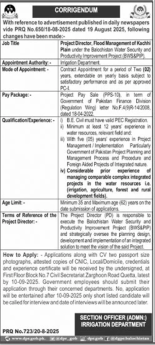 Irrigation Department announced new jobs for the position of Project Director. These jobs are related to Management category and Government jobs. The minimum qualification required for this job is Bachelor, Master, MS, BS.