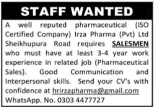 Irza Pharma announced new jobs for the position of Salesman. These jobs are related to Sales category and Government jobs. The minimum qualification required for this job is Intermediate.