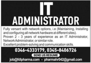 Frontier Dextrose Limited FDL announced new jobs for the position of It Administrator. These jobs are related to Management category and Government jobs. The minimum qualification required for this job is Bachelor, Master.