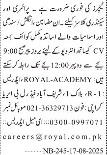 Royal Academy announced new jobs for the position of Teacher, Primary Teacher, Secondary Teacher, English Teacher, Sindhi Teacher, Islamiat Teacher. These jobs are related to Education category and Government jobs. The minimum qualification required for this job is Bachelor, Master.
