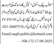 Saqib Public School announced new jobs for the position of Teacher, English Teacher. These jobs are related to Teaching category and Government jobs. The minimum qualification required for this job is Bachelor, Master.