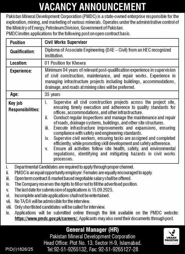 Pakistan Mineral Development Corporation announced new jobs for the position of Civil Works Supervisor. These jobs are related to Management category and Government jobs. The minimum qualification required for this job is DAE.