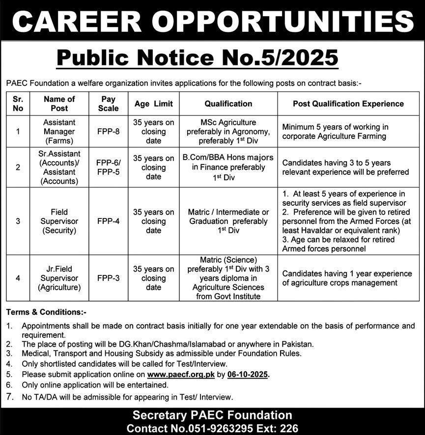Paec Foundation announced new jobs for the position of Assistant Manager Farms, Assistant Accounts, Field Supervisor Security, Field Supervisor Agriculture. These jobs are related to Management category and Government jobs. The minimum qualification required for this job is Matric, Intermediate, B.com, BBA, M.sc.