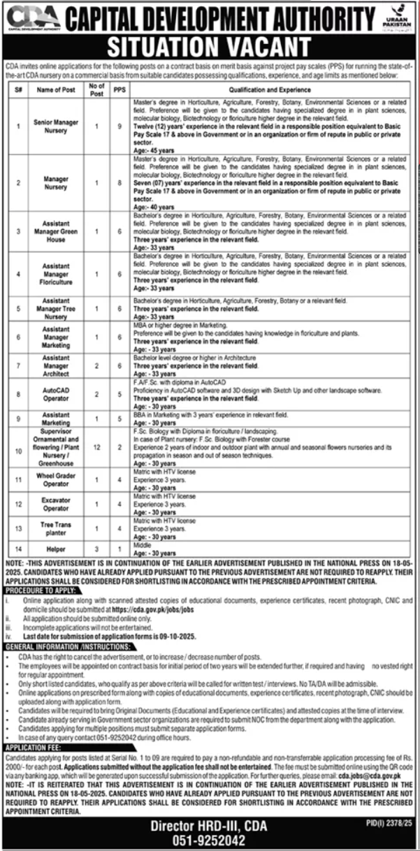 Capital Development Authority CDA announced new jobs for the position of Manager Nursery, Assistant Manager Green House, Assistant Manager Floriculture, Assistant Manager Tree Nursery, Assistant Manager Marketing, Assistant Manager Architect, Autocad Operator, Assistant Marketing, Supervisor Ornamental Flowering, Wheel Grader Operator, Excavator Operator, Tree Trans Planter, Helper. These jobs are related to Management category and Government jobs. The minimum qualification required for this job is Middle, Matric, Intermediate, Bachelor, Master.