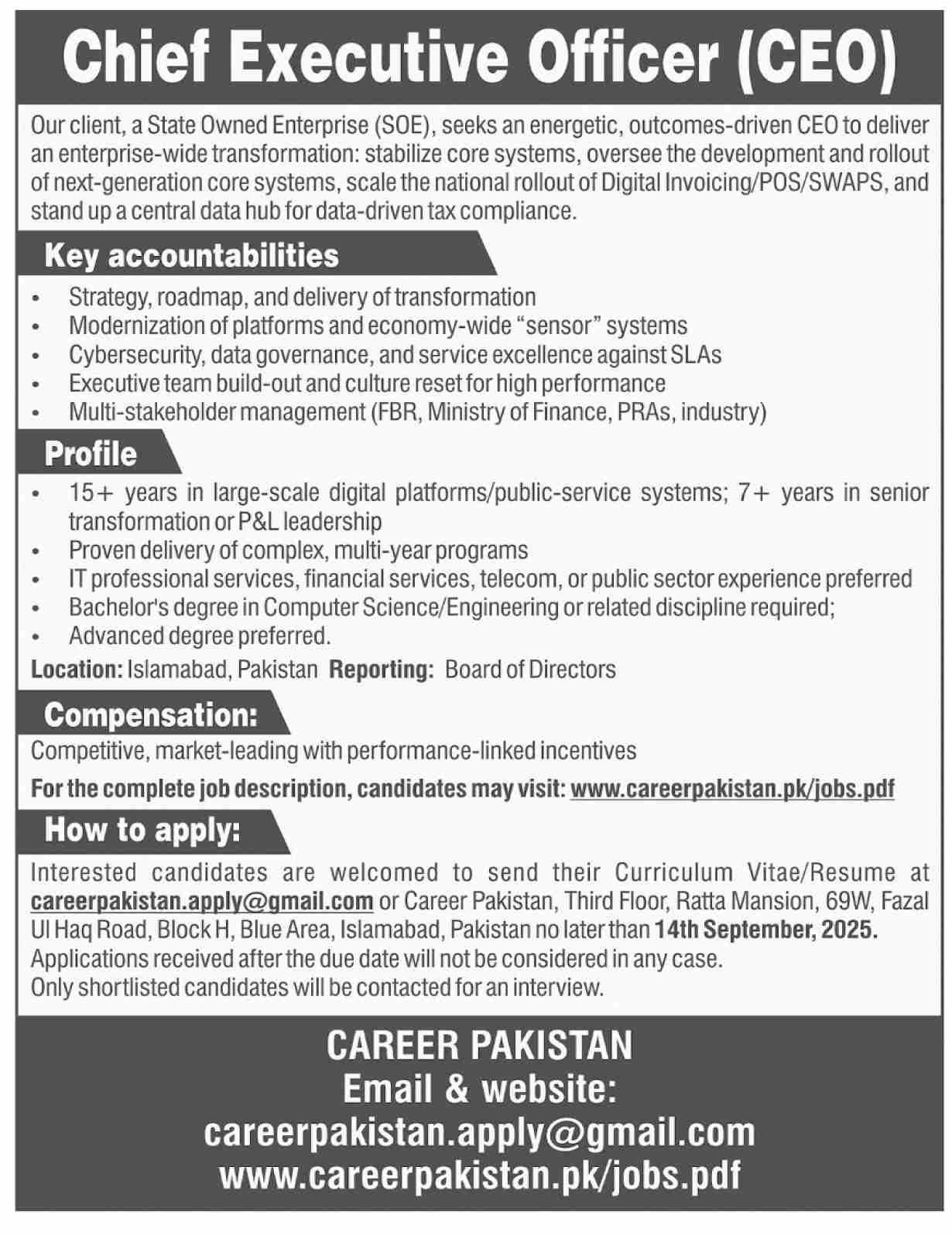 Career Pakistan CP announced new jobs for the position of Chief Executive Officer. These jobs are related to Manufacturing category and Government jobs. The minimum qualification required for this job is Bachelor, Master.