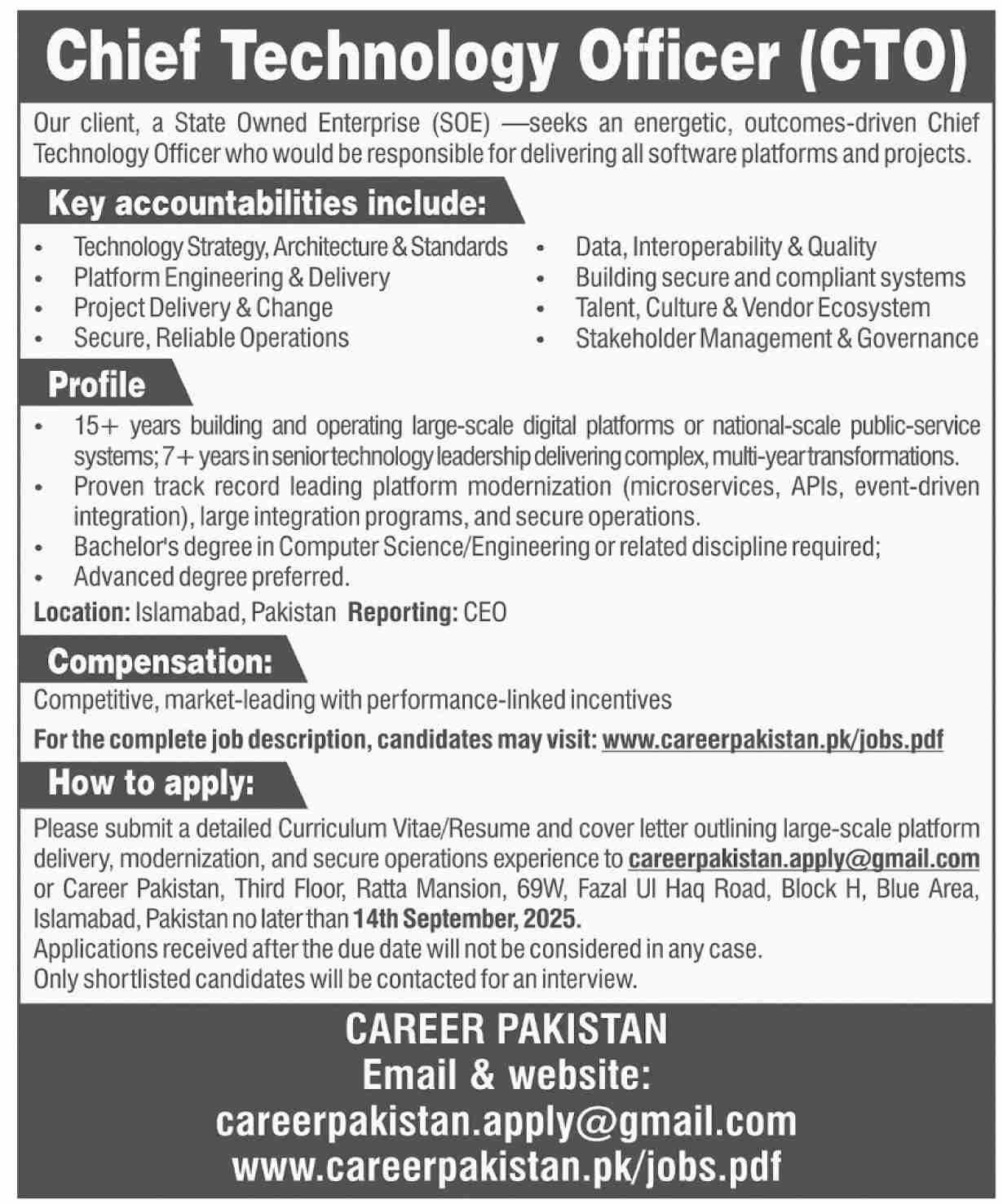 Career Pakistan CP announced new jobs for the position of Chief Technology Officer. These jobs are related to Management category and Government jobs. The minimum qualification required for this job is Bachelor, Master.