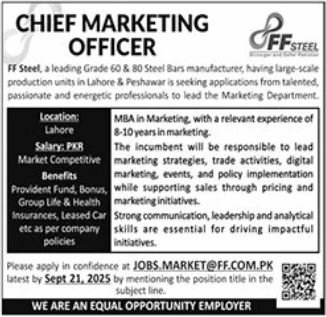 FF Steel Manufacturing Industry announced new jobs for the position of Chief Marketing Officer. These jobs are related to Management category and Government jobs. The minimum qualification required for this job is MBA.
