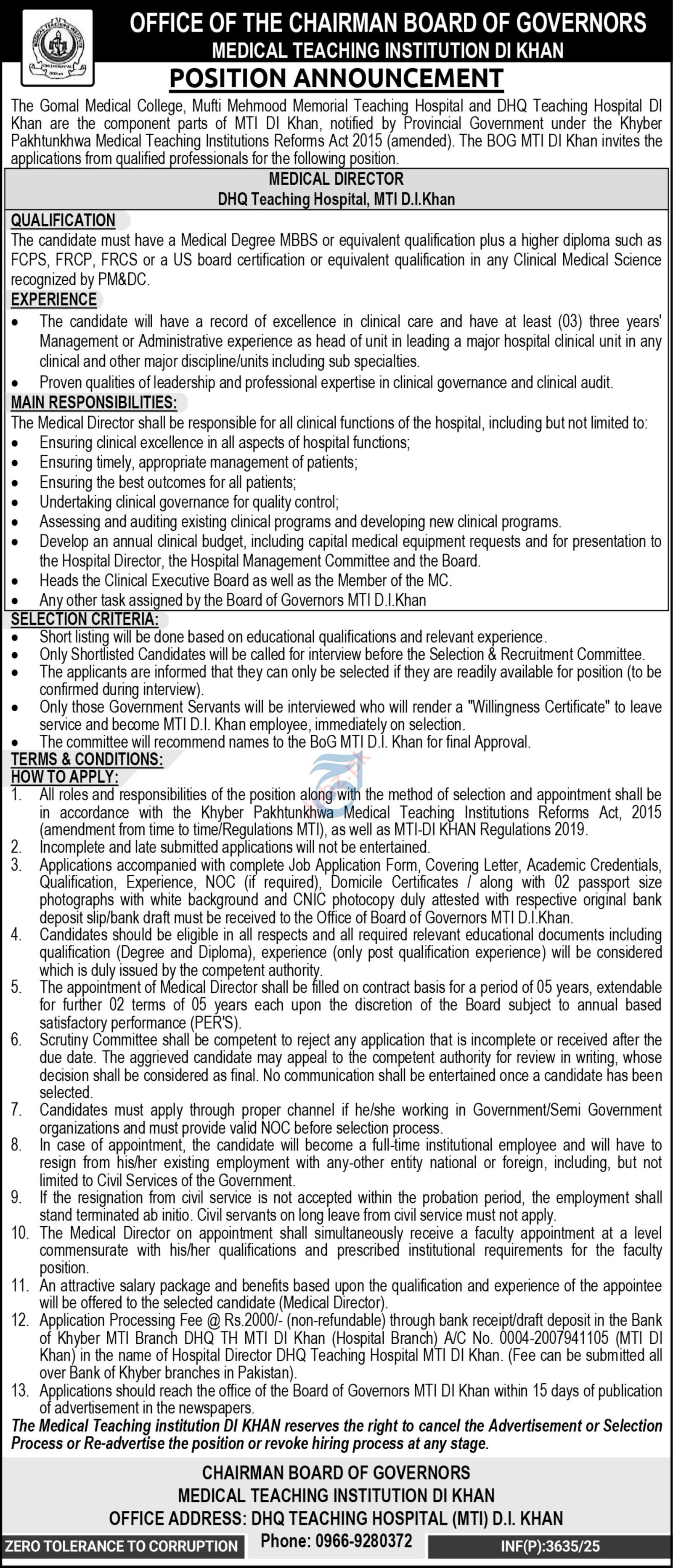 Medical Teaching Institution MTI announced new jobs for the position of Medical Director. These jobs are related to Management category and Government jobs. The minimum qualification required for this job is MBBS.
