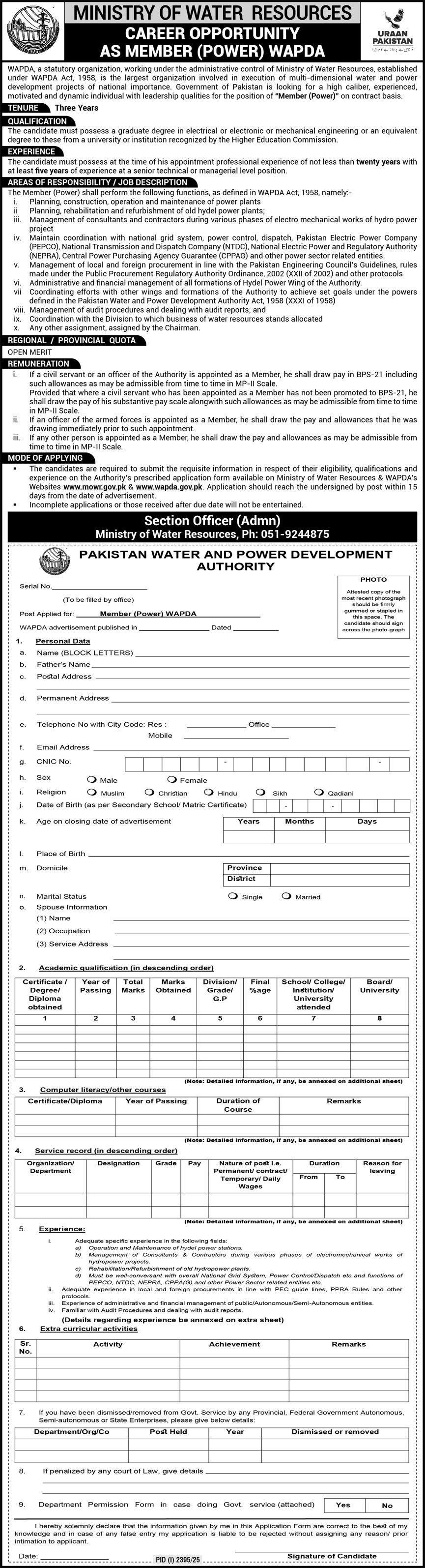 Ministry of Water Resources MOWR announced new jobs for the position of Member Power. These jobs are related to Management category and Government jobs. The minimum qualification required for this job is Bachelor, Master.