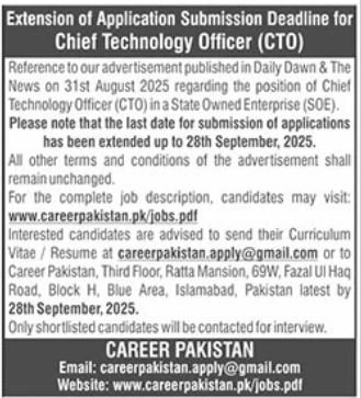 Career Pakistan CP announced new jobs for the position of Chief Technology Officer. These jobs are related to Management category and Government jobs. The minimum qualification required for this job is Bachelor, Master.