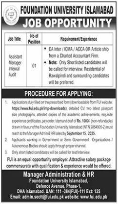 Foundation University Islamabad announced new jobs for the position of Assistant Manager Internal Audit. These jobs are related to Management category and Government jobs. The minimum qualification required for this job is ACCA, CA.