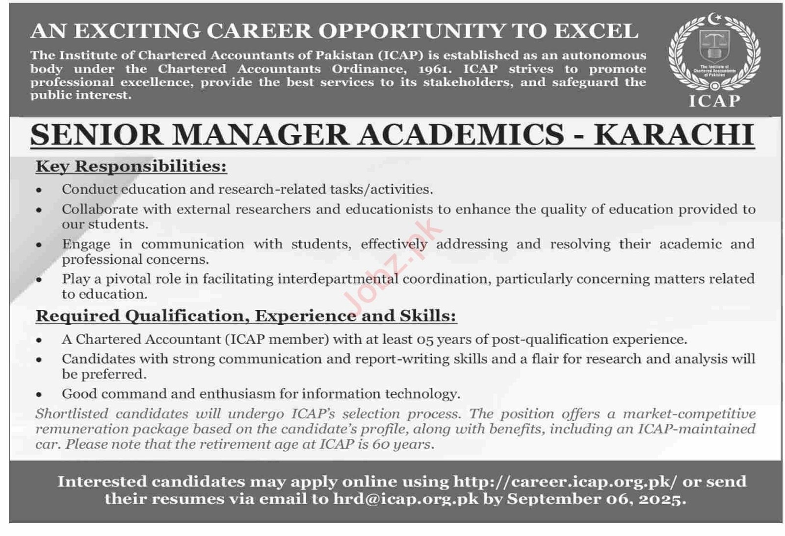 Institute of Chartered Accountants of Pakistan ICAP announced new jobs for the position of Manager Academics. These jobs are related to Management category and Government jobs. The minimum qualification required for this job is ACCA, CA.