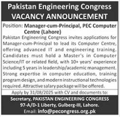 Pakistan Engineering Congress PEC announced new jobs for the position of Manager Cum Principal. These jobs are related to Management category and Government jobs. The minimum qualification required for this job is Bachelor, Master.