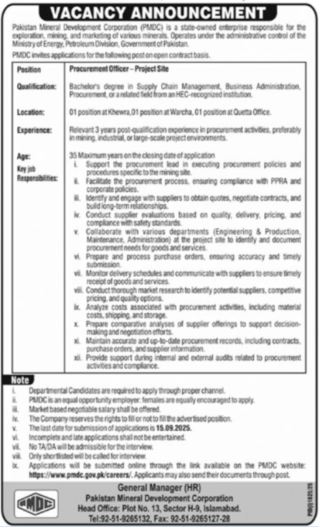 Pakistan Mineral Development Corporation announced new jobs for the position of Procurement Officer. These jobs are related to Management category and Government jobs. The minimum qualification required for this job is Bachelor.