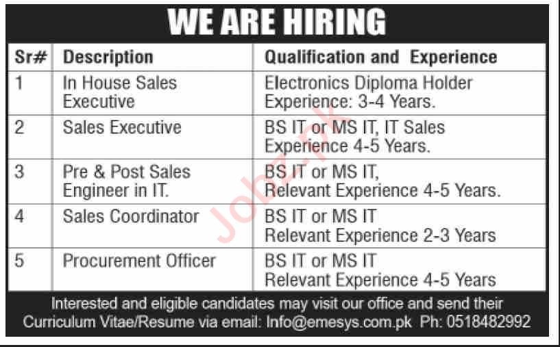 Emerging Systems Engineering ESE announced new jobs for the position of In House Sales Executive, Sales Executive, Pre Post Sales Engineer, Sales Coordinator, Procurement Officer. These jobs are related to Management category and Government jobs. The minimum qualification required for this job is Bachelor, Master, BIT, MIT, DAE.