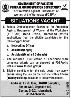 Federal Ombudsman Secretariat announced new jobs for the position of Networking Officer, Assistant Legal, Assistant Media Outreach. These jobs are related to Management category and Government jobs. The minimum qualification required for this job is Bachelor, Master.