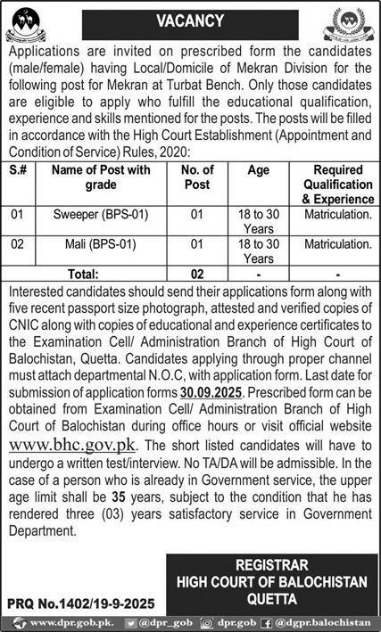High Court of Balochistan BHC announced new jobs for the position of Sweeper, Mali. These jobs are related to Labor category and Government jobs. The minimum qualification required for this job is Middle.