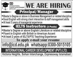International Career Development Pvt Ltd announced new jobs for the position of Principal, Manager, Ielts Instructor. These jobs are related to Management category and Government jobs. The minimum qualification required for this job is Master.