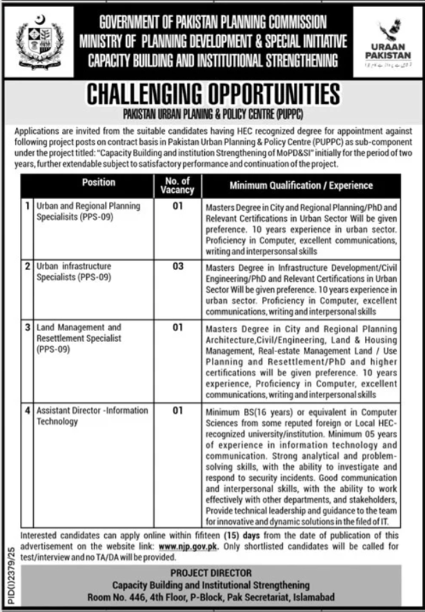 Ministry of Planning Development and Special Initiative announced new jobs for the position of Urban Regional Planning Specialist, Urban Infrastructure Specialist, Land Management Resettlement Specialist, Assistant Director Information Technology. These jobs are related to Management category and Government jobs. The minimum qualification required for this job is Bachelor, Master.
