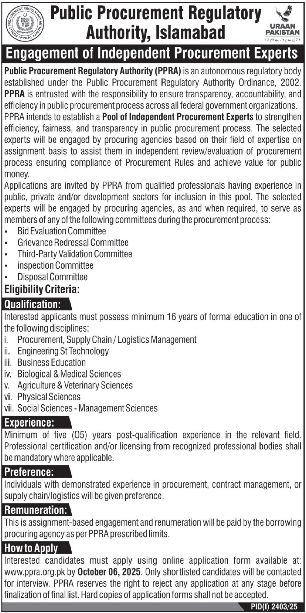 Public Procurement Regulatory Authority PPRA announced new jobs for the position of Independent Procurement Expert. These jobs are related to Management category and Government jobs. The minimum qualification required for this job is Bachelor, Master.