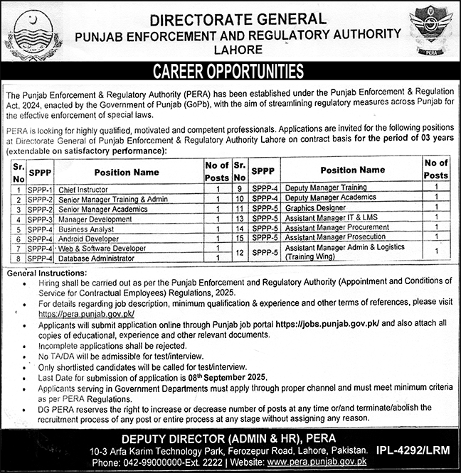 Punjab Enforcement and Regulatory Authority PERA announced new jobs for the position of Chief Instructor, Manager Training Admin, Manager Academics, Manager Development, Business Analyst, Android Developer, Web Software Developer, Database Administrator, Deputy Manager Training, Graphic Designer, Assistant Manager. These jobs are related to Management category and Government jobs. The minimum qualification required for this job is Bachelor, Master.