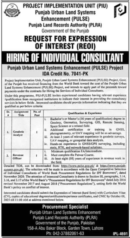 Punjab Land Records Authority PLRA announced new jobs for the position of Geodetic Analyst, Revenue Officer. These jobs are related to Management category and Government jobs. The minimum qualification required for this job is Intermediate, Bachelor, Master.
