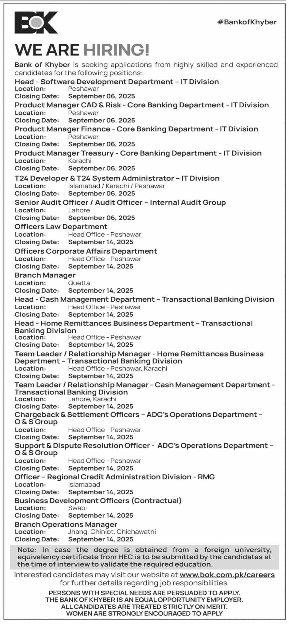 The Bank of Khyber BOK announced new jobs for the position of Head, Product Manager, Developer, Audit Officer, Officer Law Department, Officer Corporate Affairs Department, Branch Manager, Team Leader, Relationship Manager, Chargeback Settlement Officer, Support Dispute Resolution Officer, Officer, Business Development Officer, Branch Operations Manager. These jobs are related to Management category and Government jobs. The minimum qualification required for this job is Bachelor, Master.