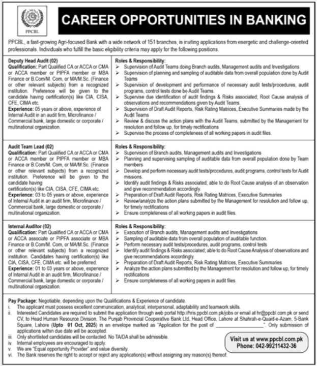 The Punjab Provincial Cooperative Bank Ltd PPCBL announced new jobs for the position of Deputy Head Audit, Audit Team Lead, Internal Auditor. These jobs are related to Management category and Government jobs. The minimum qualification required for this job is MA, ACCA, CA, M.sc.