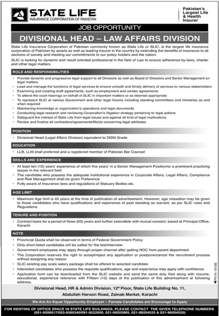 State Life Insurance Corporation of Pakistan announced new jobs for the position of Divisional Head. These jobs are related to Management category and Government jobs. The minimum qualification required for this job is Bachelor, Master.
