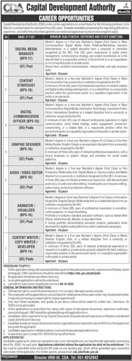 Capital Development Authority CDA announced new jobs for the position of Digital Media Manager, Content Strategist, Digital Communication Officer, Graphic Designer, Audio Editor, Video Editor, Animator, Content Writer, Copy Writer, Developer. These jobs are related to Management category and Government jobs. The minimum qualification required for this job is Master.