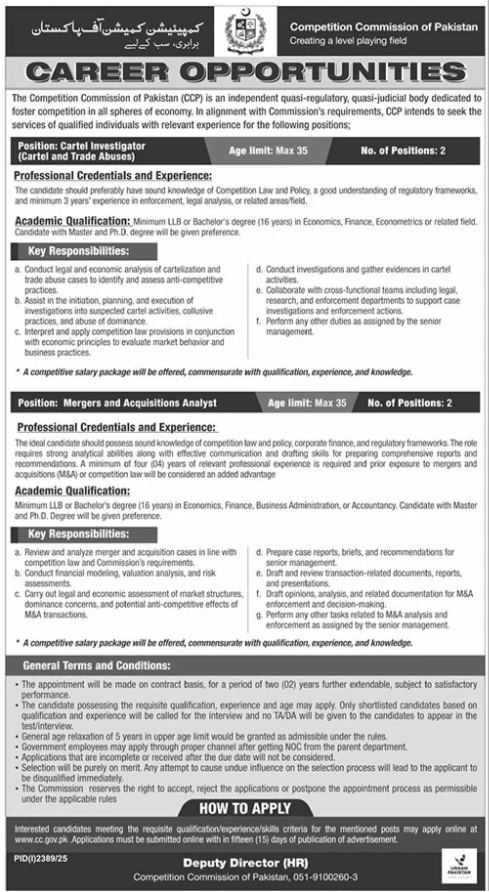 Competition Commission of Pakistan announced new jobs for the position of Cartel Investigator, Mergers Acquisition Analyst. These jobs are related to Management category and Government jobs. The minimum qualification required for this job is Bachelor, Master.