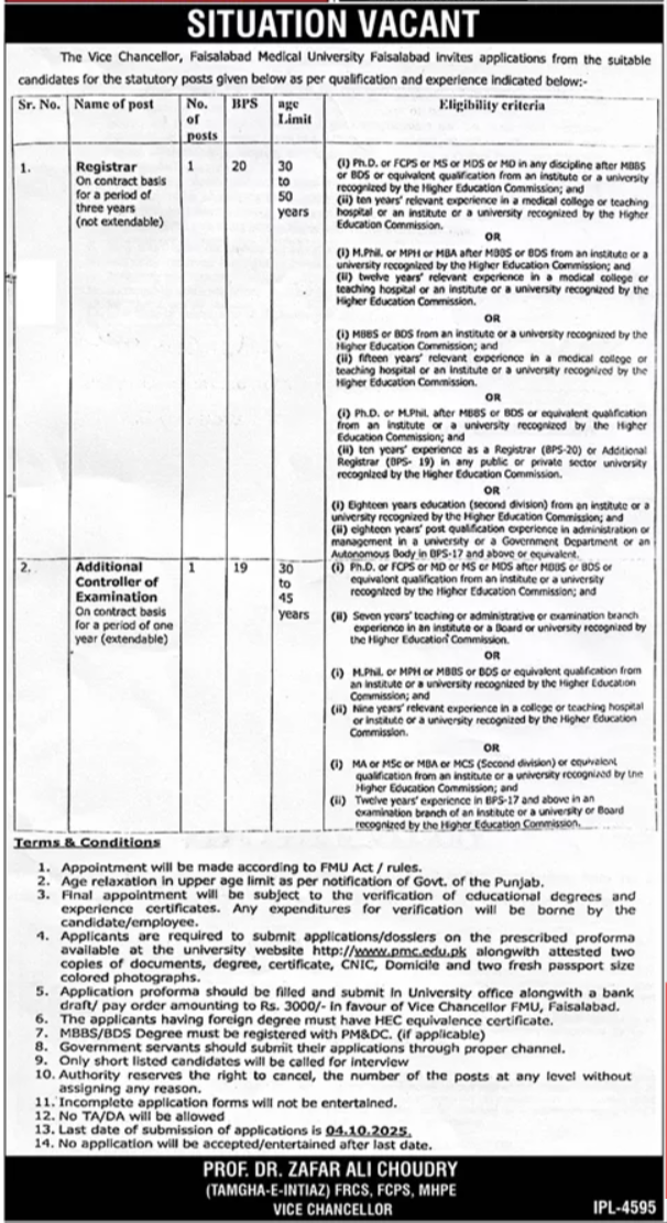Faisalabad Medical University announced new jobs for the position of Registrar, Additional Controller Of Examination. These jobs are related to Management category and Government jobs. The minimum qualification required for this job is Mphil, Phd, MA, M.sc.