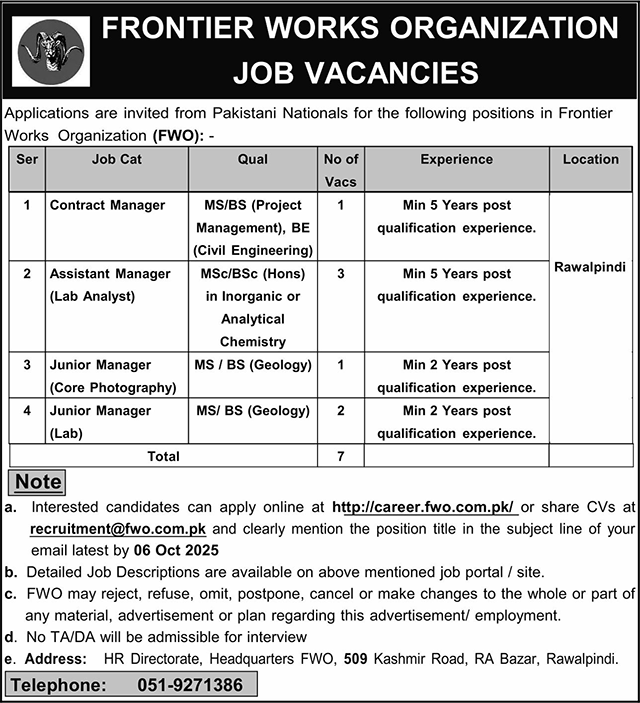 Frontier Works Organization FWO announced new jobs for the position of Contract Manager, Assistant Manager Lab Analyst, Manager Core Photography, Manager Lab. These jobs are related to Management category and Government jobs. The minimum qualification required for this job is M.sc, MS, BS.