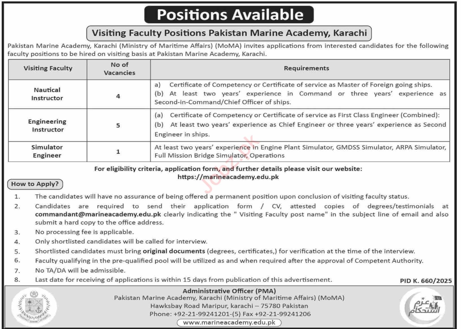 Pakistan Marine Academy announced new jobs for the position of Nautical Instructor, Engineering Instructor, Simulator Engineer. These jobs are related to Management category and Government jobs. The minimum qualification required for this job is Bachelor.