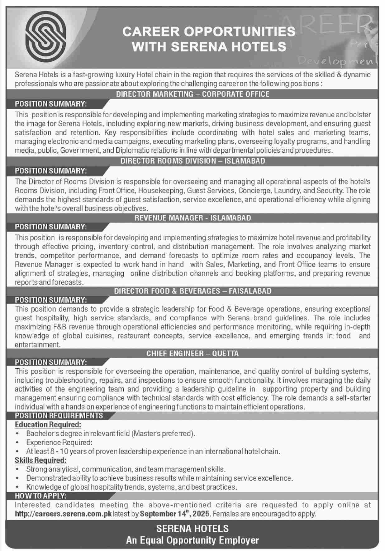 Serena Hotel announced new jobs for the position of Director Marketing, Director Rooms Division, Revenue Manager, Director Food Beverages, Chief Engineer. These jobs are related to Management category and Government jobs. The minimum qualification required for this job is Bachelor, Master.
