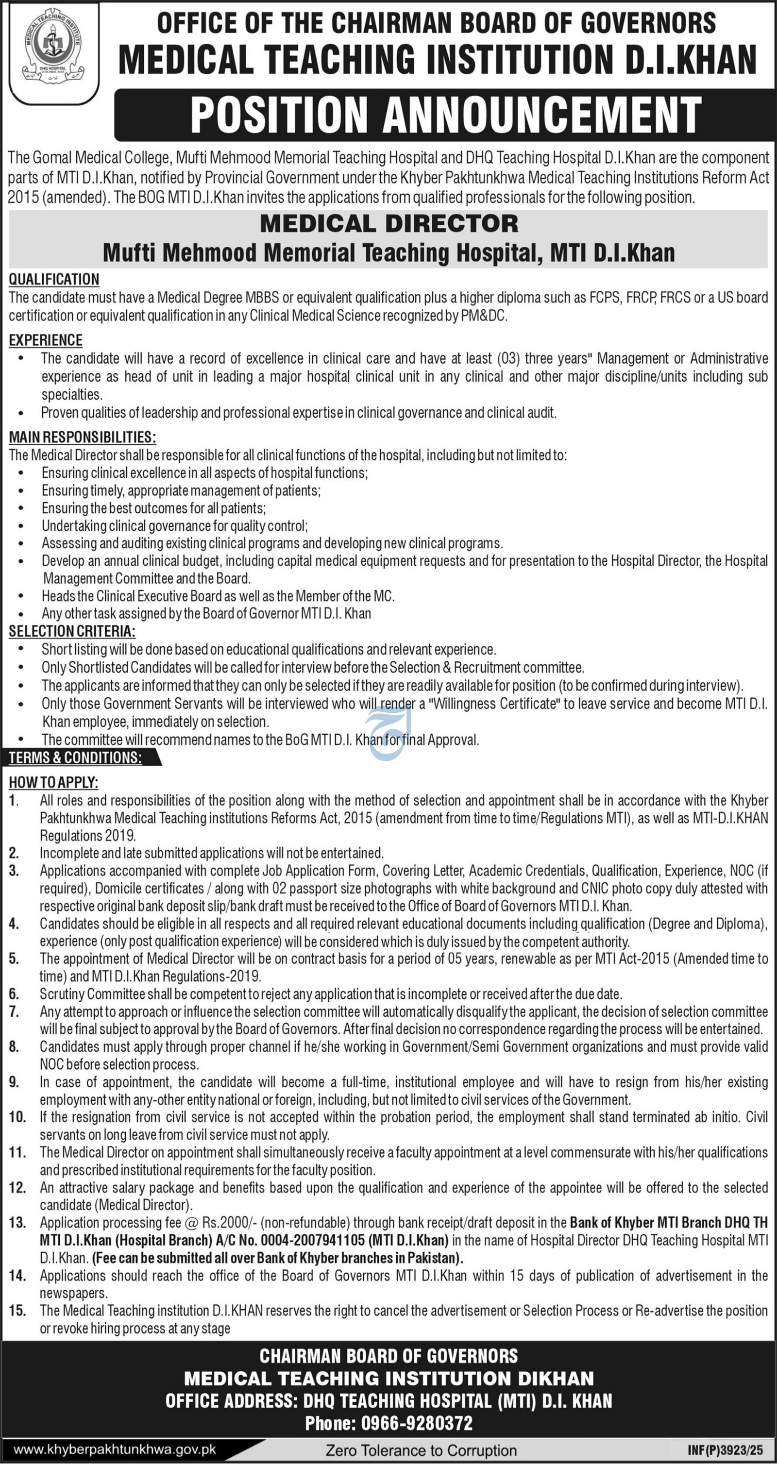Medical Teaching Institution MTI announced new jobs for the position of Medical Director. These jobs are related to Management category and Government jobs. The minimum qualification required for this job is MBBS.