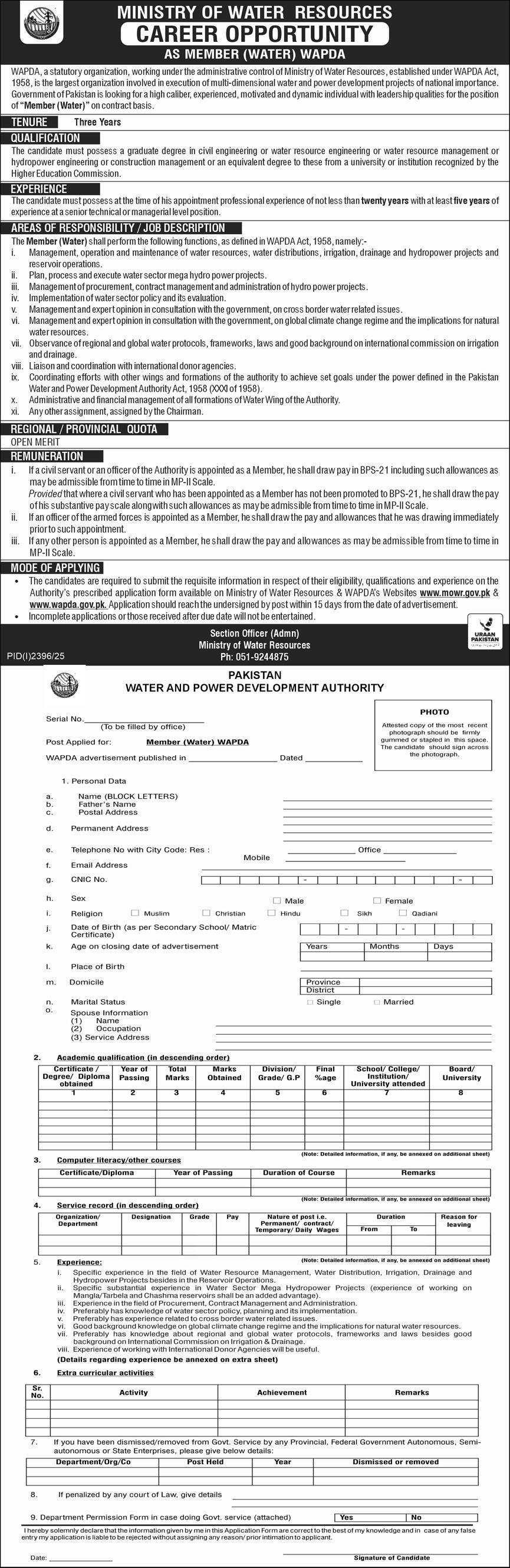Ministry of Water Resources MOWR announced new jobs for the position of Member Water. These jobs are related to Management category and Government jobs. The minimum qualification required for this job is Bachelor, Master.