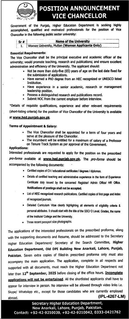 Higher Education Department announced new jobs for the position of Vice Chancellor. These jobs are related to Management category and Government jobs. The minimum qualification required for this job is Phd.