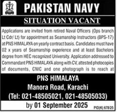 Pakistan Navy announced new jobs for the position of Seamanship Instructor. These jobs are related to Education category and Government jobs. The minimum qualification required for this job is Bachelor.