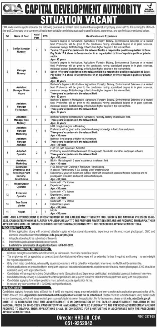 Capital Development Authority CDA announced new jobs for the position of Digital Media Manager, Content Strategist, Digital Communication Officer, Graphic Designer, Audio Editor, Video Editor, Animator, Content Writer, Copy Writer, Developer. These jobs are related to Management category and Government jobs. The minimum qualification required for this job is Matric, Intermediate, Bachelor, BS.