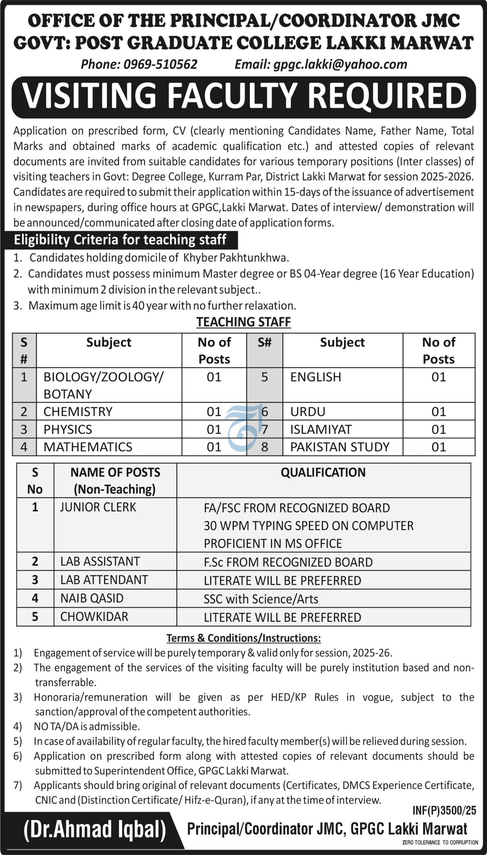 Post Graduate College announced new jobs for the position of Teaching Staff, Clerk, Lab Assistant, Lab Attendant, Naib Qasid, Chowkidar. These jobs are related to Management category and Government jobs. The minimum qualification required for this job is Primary, Matric, Intermediate, Mphil, MS.