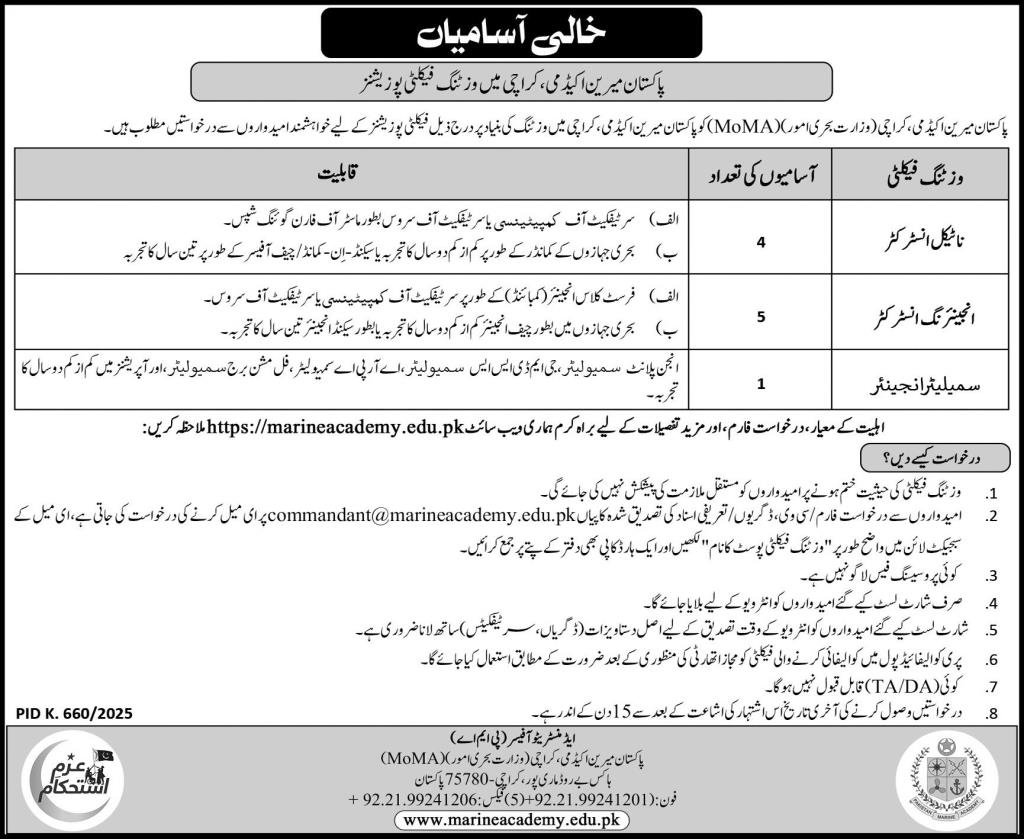 Pakistan Marine Academy announced new jobs for the position of Nautical Instructor, Engineering Instructor, Simulator Engineer. These jobs are related to Management category and Government jobs. The minimum qualification required for this job is Intermediate, Bachelor, B.E.