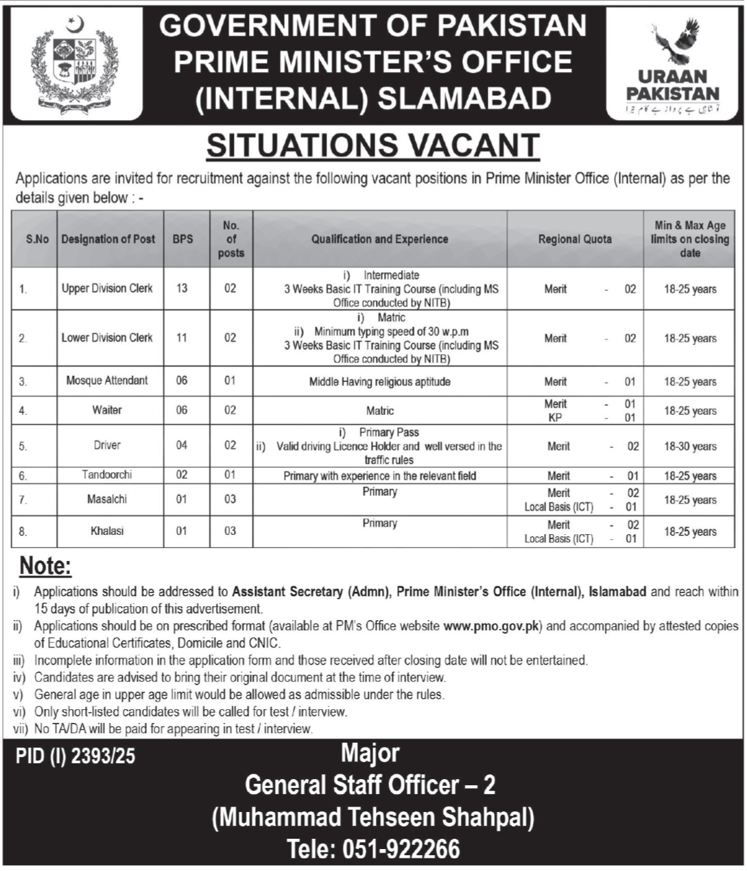 Prime Minister Office announced new jobs for the position of Upper Division Clerk, Lower Division Clerk, Mosque Attendant, Waiter, Driver, Tandoorchi, Masalchi, Khalasi. These jobs are related to Management category and Government jobs. The minimum qualification required for this job is Primary, Matric, Intermediate.