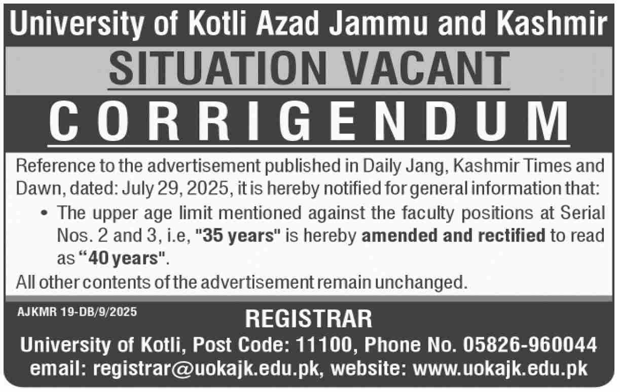 University of Kotli announced new jobs for the position of Associate Professor, Assistant Professor, Lecturer. These jobs are related to Education category and Government jobs. The minimum qualification required for this job is Mphil, Phd, MS.
