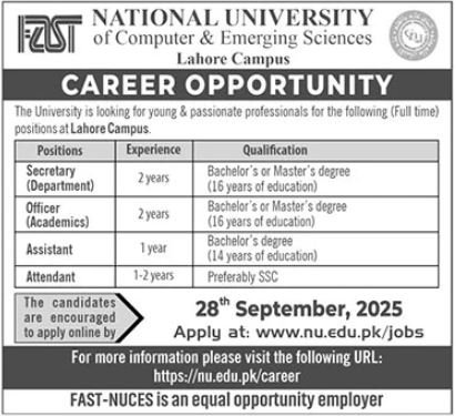 National University of Computer & Emerging Sciences announced new jobs for the position of Secretary, Officer Academics, Assistant, Attendant. These jobs are related to Management category and Government jobs. The minimum qualification required for this job is Bachelor, Master.