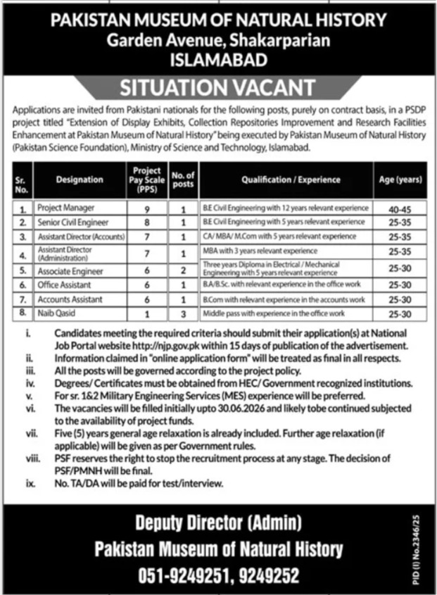 Pakistan Museum of Natural History announced new jobs for the position of Project Manager, Civil Engineer, Assistant Director Accounts, Assistant Director Administration, Associate Engineer, Office Assistant, Accounts Assistant, Naib Qasid. These jobs are related to Management category and Government jobs. The minimum qualification required for this job is Middle, BA, B.com, MBA, B.E, BS.