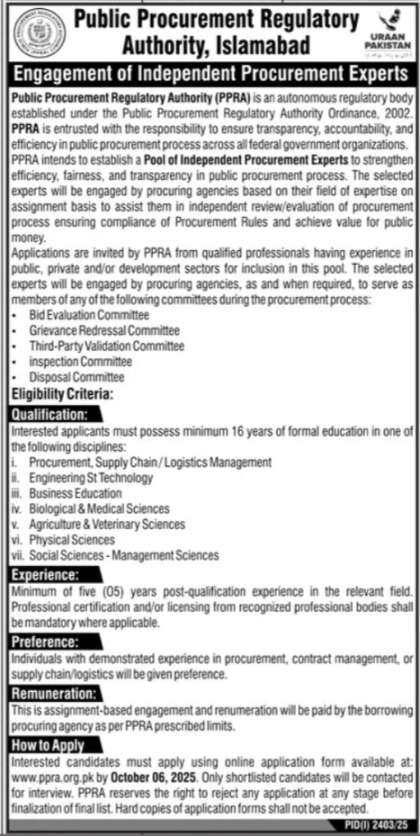 Public Procurement Regulatory Authority PPRA announced new jobs for the position of Independent Procurement Expert. These jobs are related to Management category and Government jobs. The minimum qualification required for this job is Bachelor, Master.