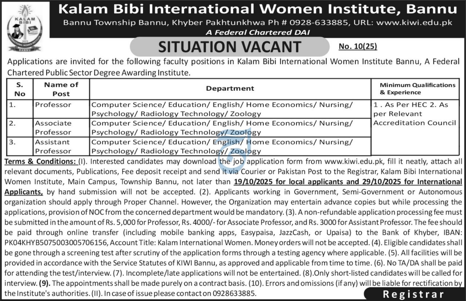 Kalam Bibi International Women Institute announced new jobs for the position of Professor, Associate Professor, Assistant Professor. These jobs are related to Education category and Government jobs. The minimum qualification required for this job is Bachelor, Master, Mphil, Phd.