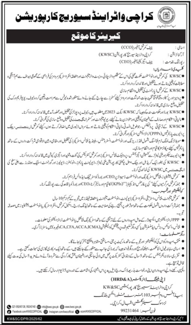 Karachi Water & Sewerage Corporation KWSC announced new jobs for the position of Chief Commercial Officer. These jobs are related to Finance category and Government jobs. The minimum qualification required for this job is Master, ACCA, CA, Others.